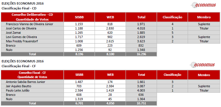 Em atendimento ao cronograma disposto no Anexo I do Regulamento do Processo Eleitoral do Economus, divulgamos nesta data, 15.04.2016, o resultado das Eleições 2016, apresentando os novos membros titulares e suplentes para compor os colegiados dos Conselhos Deliberativo e Fiscal, a partir de 01 de junho de 2016.